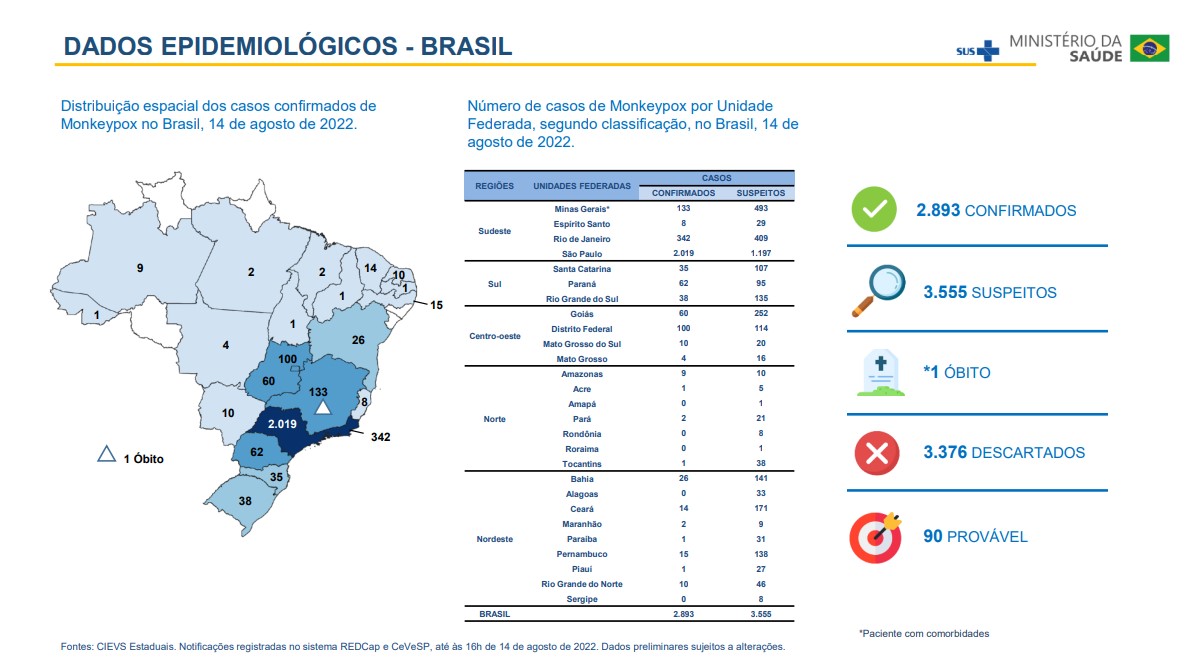 No mundo, já são 35.621 casos confirmados de Monkeypox, segundo as Atualizações da Secretaria de Vigilância em Saúde, do Ministério da Saúde, divulgadas em 15/8. Os dados epidemiológicos apontam que 92 países registraram casos e 13 óbitos, incluindo um no Brasil, país que é o 6º na lista dos mais afetados, com 2.893 confirmados.