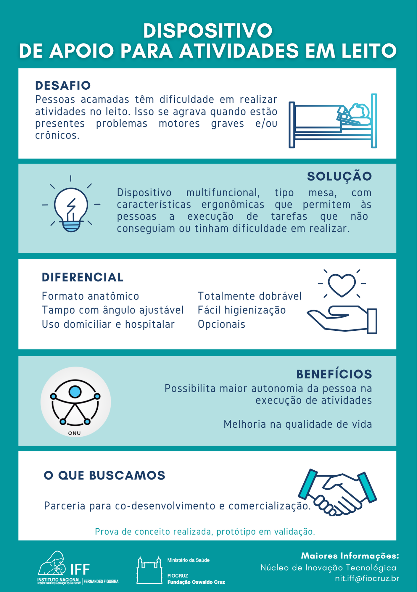 Módulo de apoio para realização de atividades em leito. Idealizado para pessoas com mobilidade reduzida no tronco superior, possui formato anatômico que se encaixa ao corpo de maneira ergonômica e permite o posicionamento de braços e punhos. Apresenta tampo multifuncional ajustável. É higienizável, dobrável e portátil.