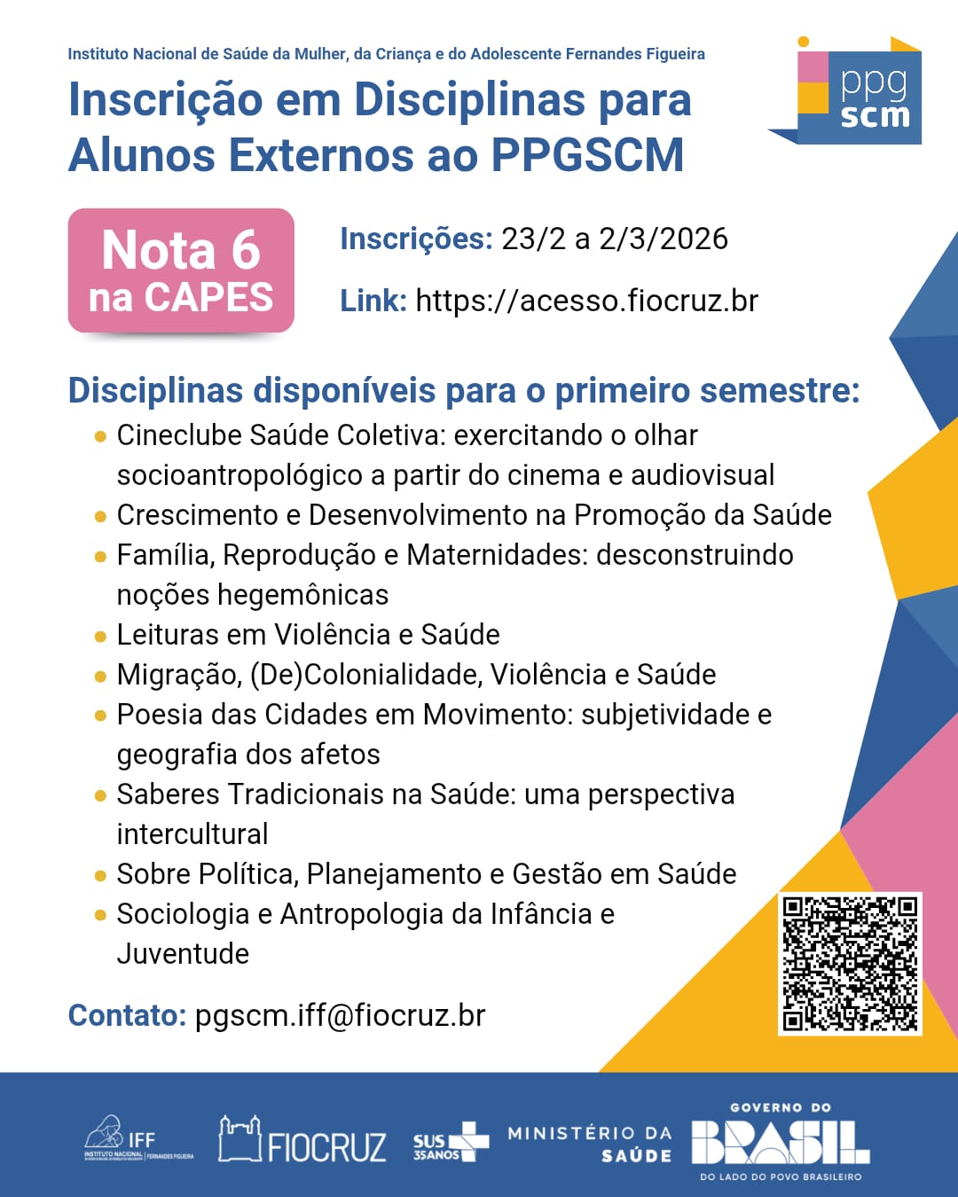 j) Selecione a opção Disciplina PGSCM (Saúde Coletiva) para Candidatos Externos - 2026.01 em Saúde da Criança e da Mulher;